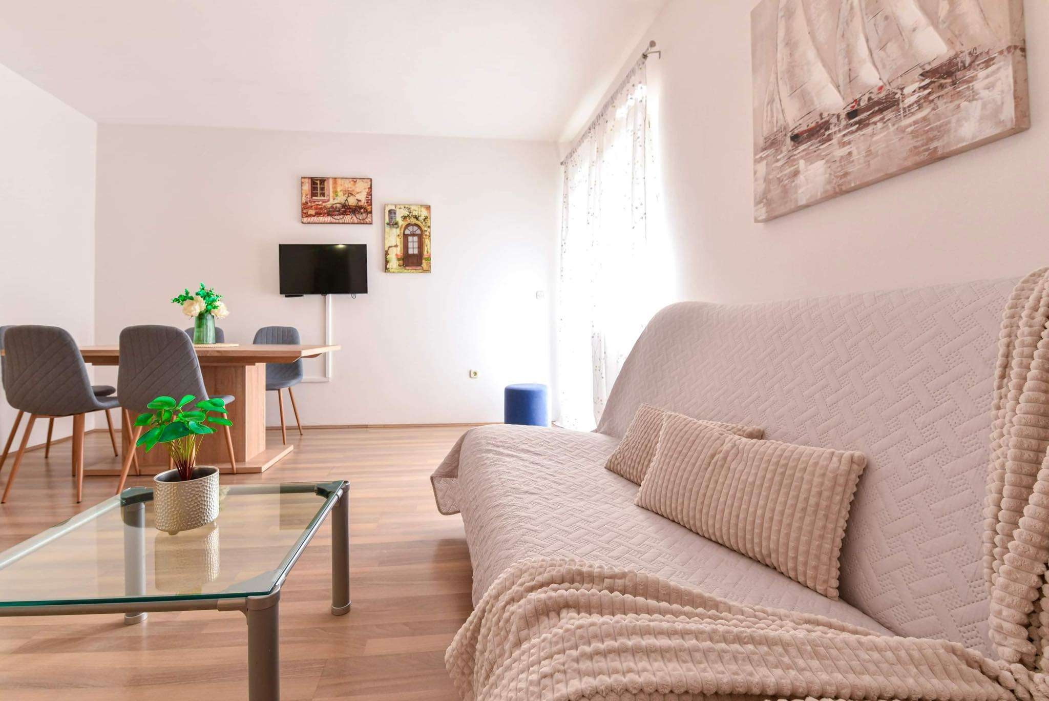 Apartment can accommodate 4 guests. Beds are situated in 1 sleeping rooms, but also in the living room, within 38m2. Guests can use a private terrace to enjoy the warm summer evenings. The apartment offers the sea view. Food can be prepared using barbecue which is shared with other guests too. INCLUDED IN THE PRICE: tourist tax, final cleaning, air-conditioning, parking, internet, baby cot, iron, ironing board. OBLIGATORY ADDITIONAL COSTS: short stay fee (surcharge depending on a number of booked nights: 30% - 1, 20% - 2, 10% - 3). The availability of additional services for your chosen dates of stay, as well as their prices (if none are listed) must be checked ahead of time. Any additional services not shown in the price calculation are payable directly to the property owner and only if used by the visitor. Discounts to the base price: free day 14=13 (for reservations of 14 or more days you get one free day for the stay until 31122026).