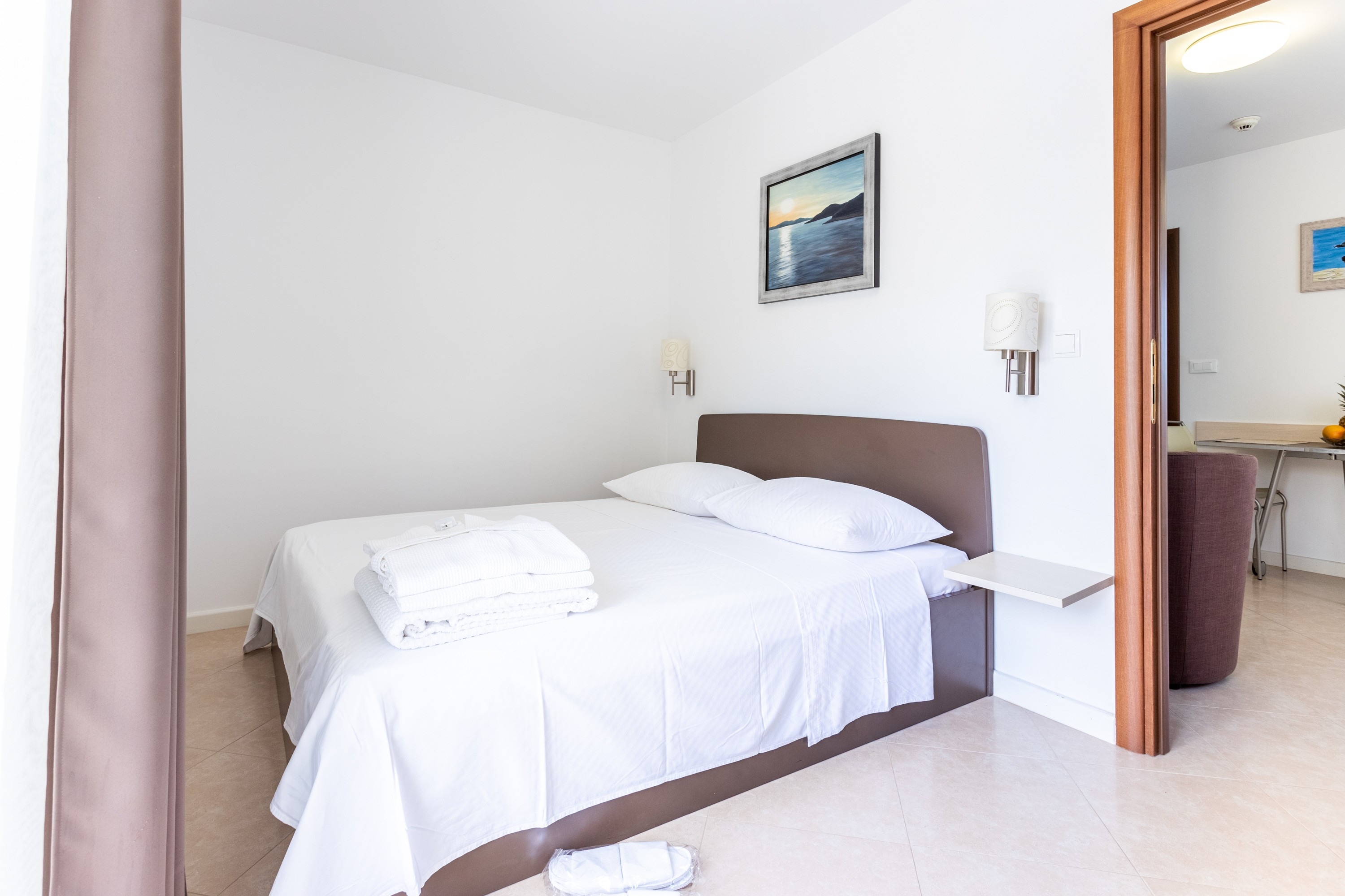 Studio flat can accommodate 2 guests. Beds are situated in 1 sleeping rooms, within 37m2. Guests can use a private terrace to enjoy the warm summer evenings. Food can be prepared using barbecue which is shared with other guests too. Shared pool is on disposal during stay. INCLUDED IN THE PRICE: tourist tax, final cleaning, air-conditioning, central heating, pool, parking, internet, baby cot, iron, ironing board, hairdryer. OBLIGATORY ADDITIONAL COSTS: short stay fee (surcharge depending on a number of booked nights: 30% - 1, 20% - 2, 10% - 3). The availability of additional services for your chosen dates of stay, as well as their prices (if none are listed) must be checked ahead of time. Any additional services not shown in the price calculation are payable directly to the property owner and only if used by the visitor.