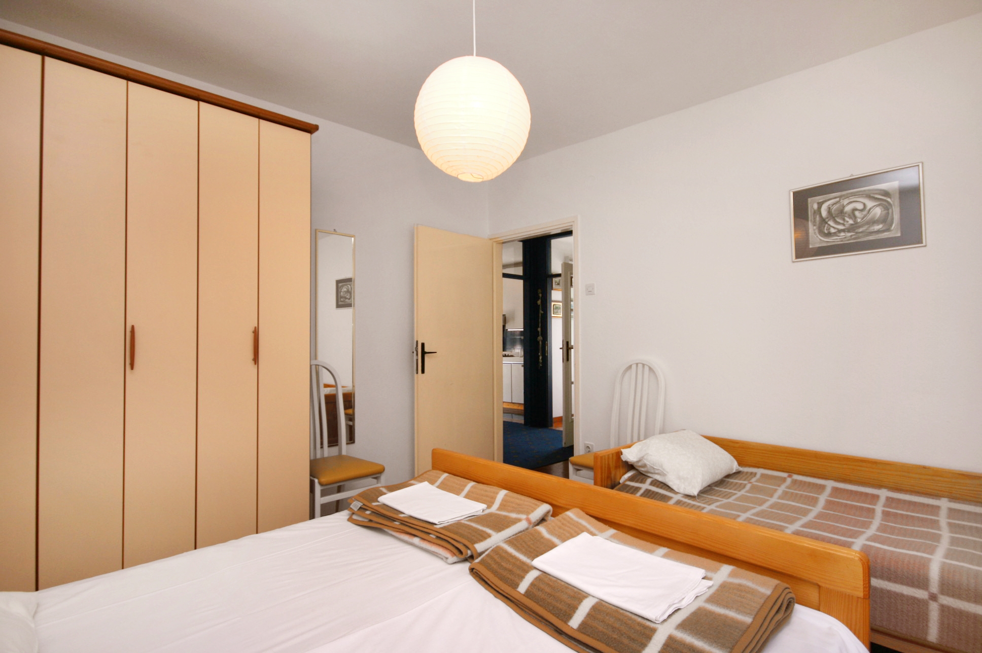 Apartment can accommodate 5 guests. Beds are situated in 2 sleeping rooms, within 56m2. Guests can use a private terrace to enjoy the warm summer evenings. The apartment offers the sea view. Food can be prepared using barbecue which is shared with other guests too. INCLUDED IN THE PRICE: tourist tax, final cleaning, air-conditioning, parking, internet, iron, ironing board, hairdryer. OBLIGATORY ADDITIONAL COSTS: short stay fee (surcharge depending on a number of booked nights: 30% - 1, 20% - 2, 10% - 3). The availability of additional services for your chosen dates of stay, as well as their prices (if none are listed) must be checked ahead of time. Any additional services not shown in the price calculation are payable directly to the property owner and only if used by the visitor.