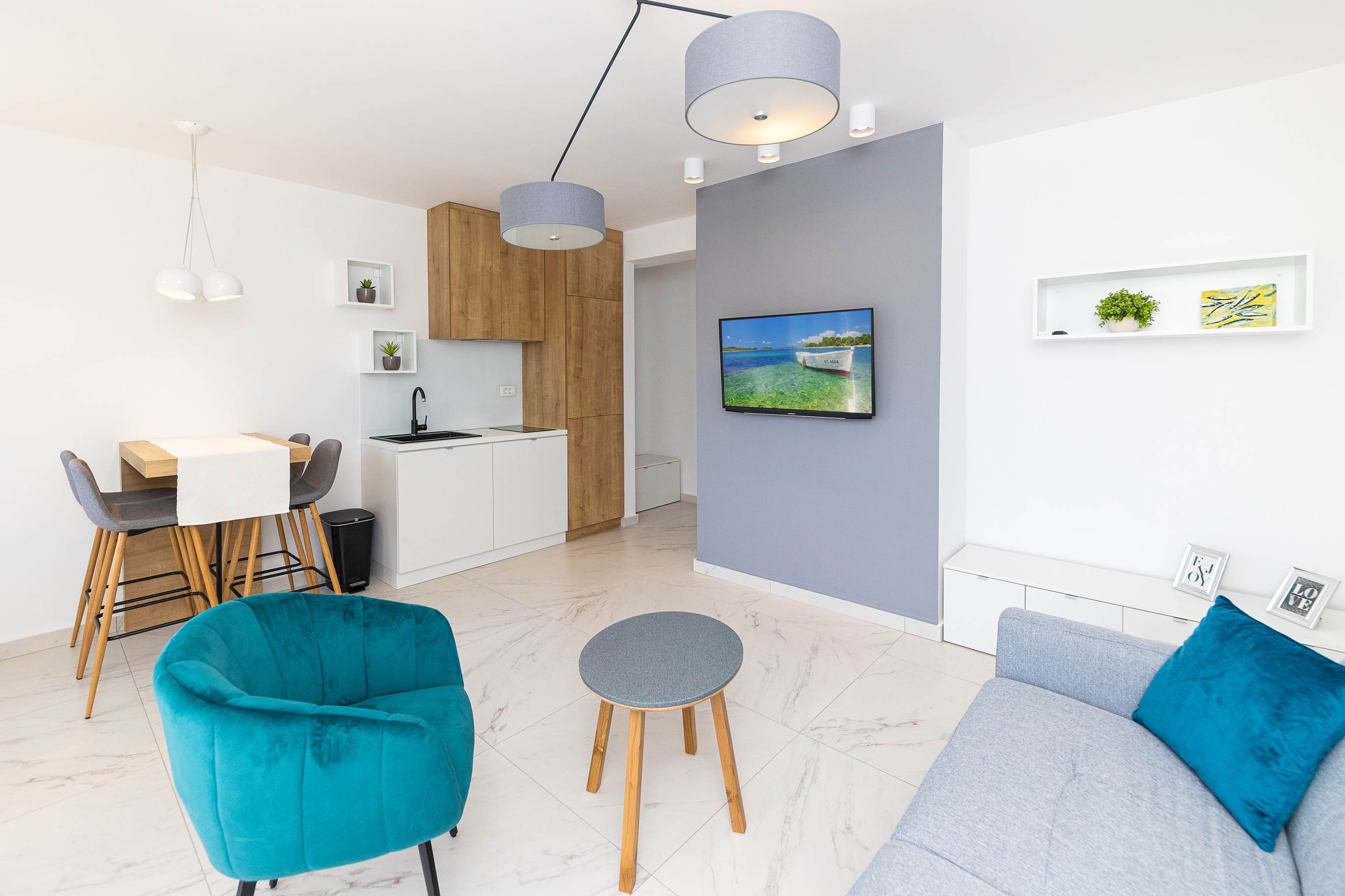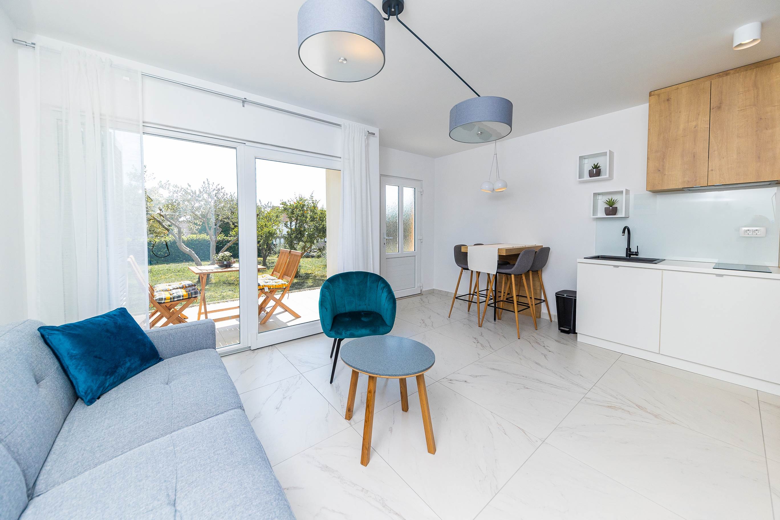 Apartment can accommodate 4 guests. Beds are situated in 1 sleeping rooms, but also in the living room, within 36m2. Guests can use a private terrace to enjoy the warm summer evenings. INCLUDED IN THE PRICE: tourist tax, final cleaning, air-conditioning, parking, internet, iron, ironing board, hairdryer. OBLIGATORY ADDITIONAL COSTS: short stay fee (surcharge depending on a number of booked nights: 30% - 1, 20% - 2, 10% - 3). OPTIONAL ADDITIONAL COSTS: laundry (€5.00 washing). The availability of additional services for your chosen dates of stay, as well as their prices (if none are listed) must be checked ahead of time. Any additional services not shown in the price calculation are payable directly to the property owner and only if used by the visitor.