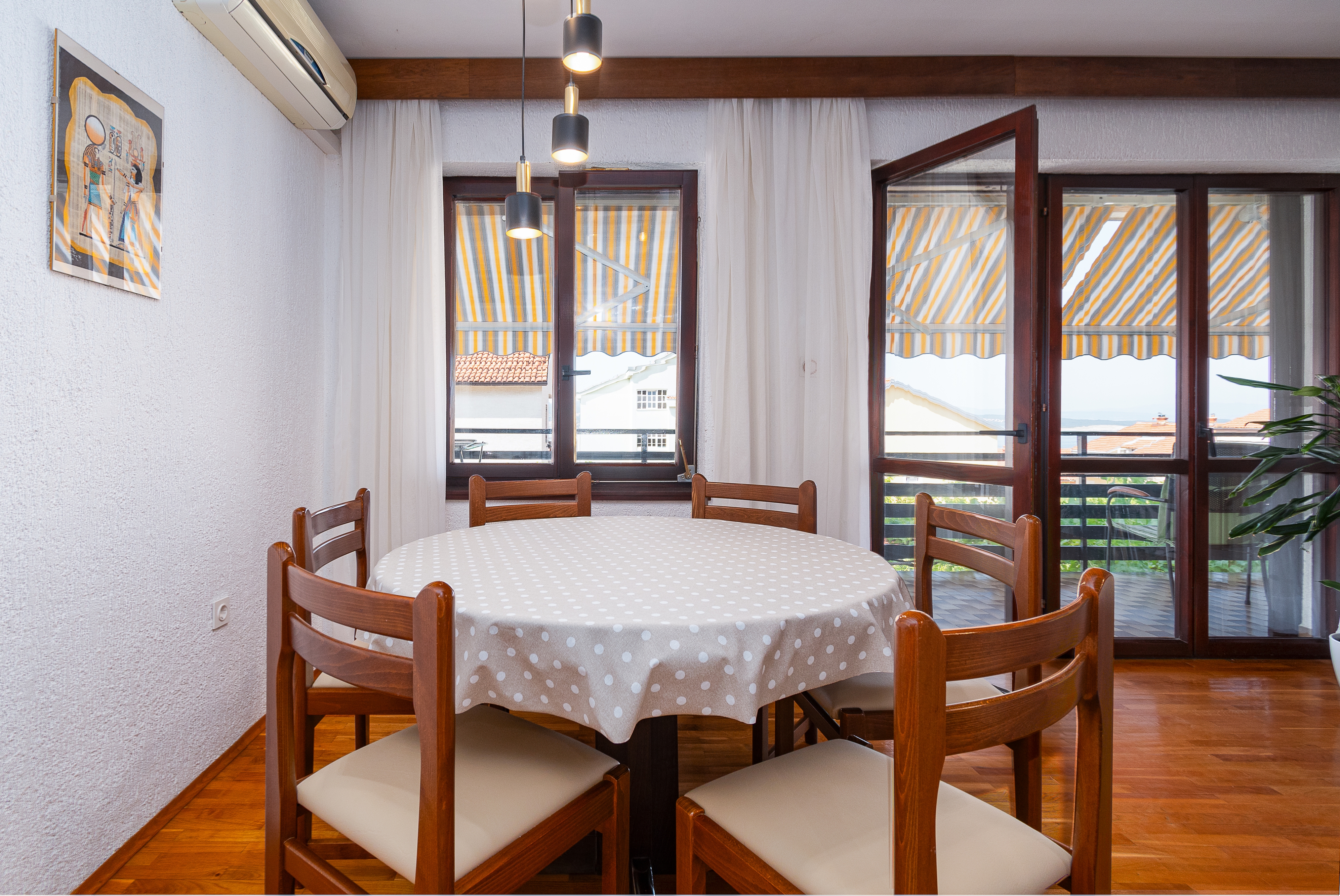 House 5494 in the town of Crikvenica, Crikvenica - Kvarner has accommodation units of type Apartment (3) and is 1.2 km away from the sea. The nearest beach to this accommodation is a pebble beach. As the house is subdividedmultiple apartments, other guests may be present during your stay. The hosts reside in the house. The house owner is under no obligation to accept additional persons and pets that were not stated in the reservation request and it is necessary to report them in advance.AMENITIES Courtyard (150m2, Sitting area), Parking lot (Number of parking spaces: 6, Distance from the house: In the courtyard), Barbecue: shared, WiFi Internet, Laundry service, Hairdryer, Iron, Ironing board LOCATION AND ACCESS Main road between the property and the beach Pedestrian flyover between the property and the beach Number of stairs from the property to the beach: 102 Car access possible: Yes The facility is situated in relatively quiet surroundings DISTANCES Sea: 1.2 km Beach: 1.2 km Center: 1.4 km Shop: 550 m Urgent medical care: 1.9 km Pharmacy: 950 m Exchange office: 2.4 km ATMBank machine: 1 km Tourist info: 1.1 km Bus station: 1 km Gas station: 1.2 km Farmers market: 1 km