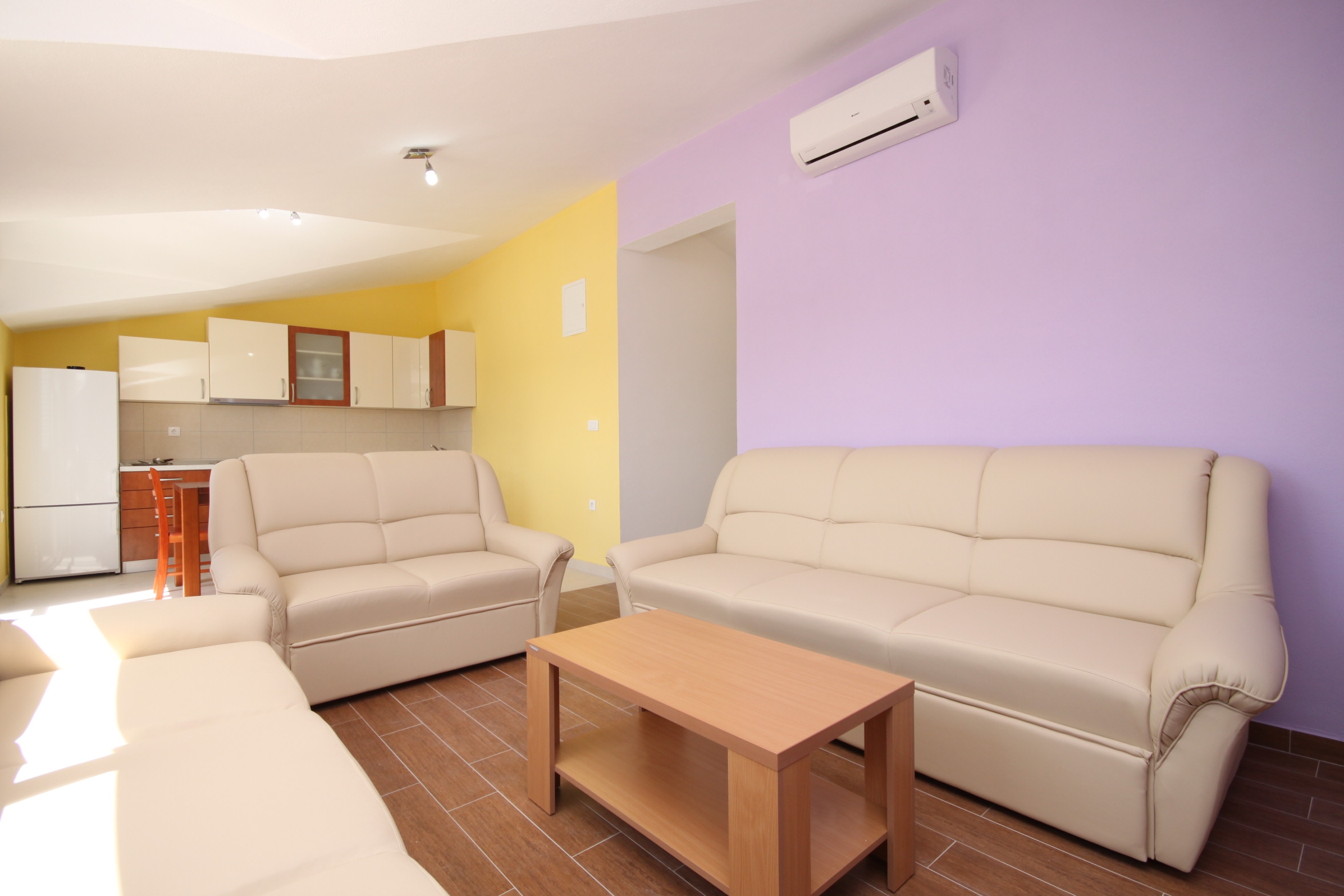 Apartment can accommodate 6 guests. Beds are situated in 2 sleeping rooms, but also in the living room, within 59m2. Guests can use a private terrace to enjoy the warm summer evenings. The apartment offers the sea view. Food can be prepared using barbecue which is shared with other guests too. This accommodation unit welcomes pets at an additional charge. INCLUDED IN THE PRICE: tourist tax, final cleaning, air-conditioning, parking, internet, iron, hairdryer. OBLIGATORY ADDITIONAL COSTS: short stay fee (surcharge depending on a number of booked nights: 30% - 1, 20% - 2, 10% - 3). OPTIONAL ADDITIONAL COSTS: laundry (€5.00 washing), boat mooring (€5.00 per night), pets (€7.00 per night), additional bed (€10.00 per night). The availability of additional services for your chosen dates of stay, as well as their prices (if none are listed) must be checked ahead of time. Any additional services not shown in the price calculation are payable directly to the property owner and only if used by the visitor.