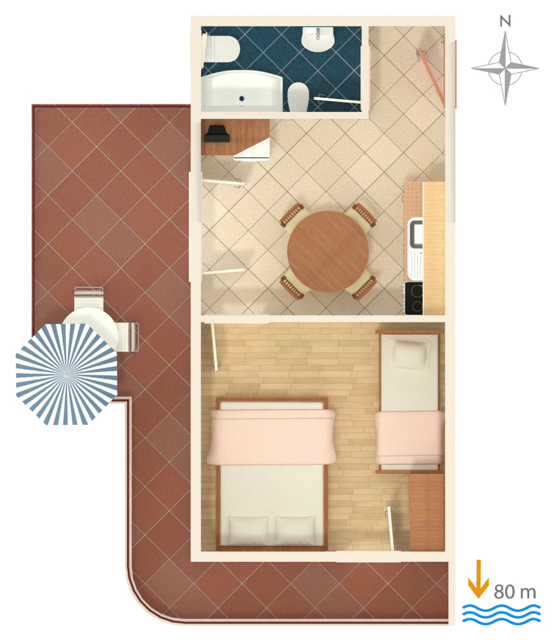 Apartment can accommodate 3 guests. Beds are situated in 1 sleeping rooms, within 25m2. Guests can use a private terrace to enjoy the warm summer evenings. The apartment offers the sea view. Food can be prepared using barbecue which is shared with other guests too. This accommodation unit welcomes pets at an additional charge. INCLUDED IN THE PRICE: tourist tax, final cleaning, air-conditioning, parking, internet. OBLIGATORY ADDITIONAL COSTS: short stay fee (surcharge depending on a number of booked nights: 30% - 1, 20% - 2, 10% - 3). OPTIONAL ADDITIONAL COSTS: pets (€5.00 per night). The availability of additional services for your chosen dates of stay, as well as their prices (if none are listed) must be checked ahead of time. Any additional services not shown in the price calculation are payable directly to the property owner and only if used by the visitor.