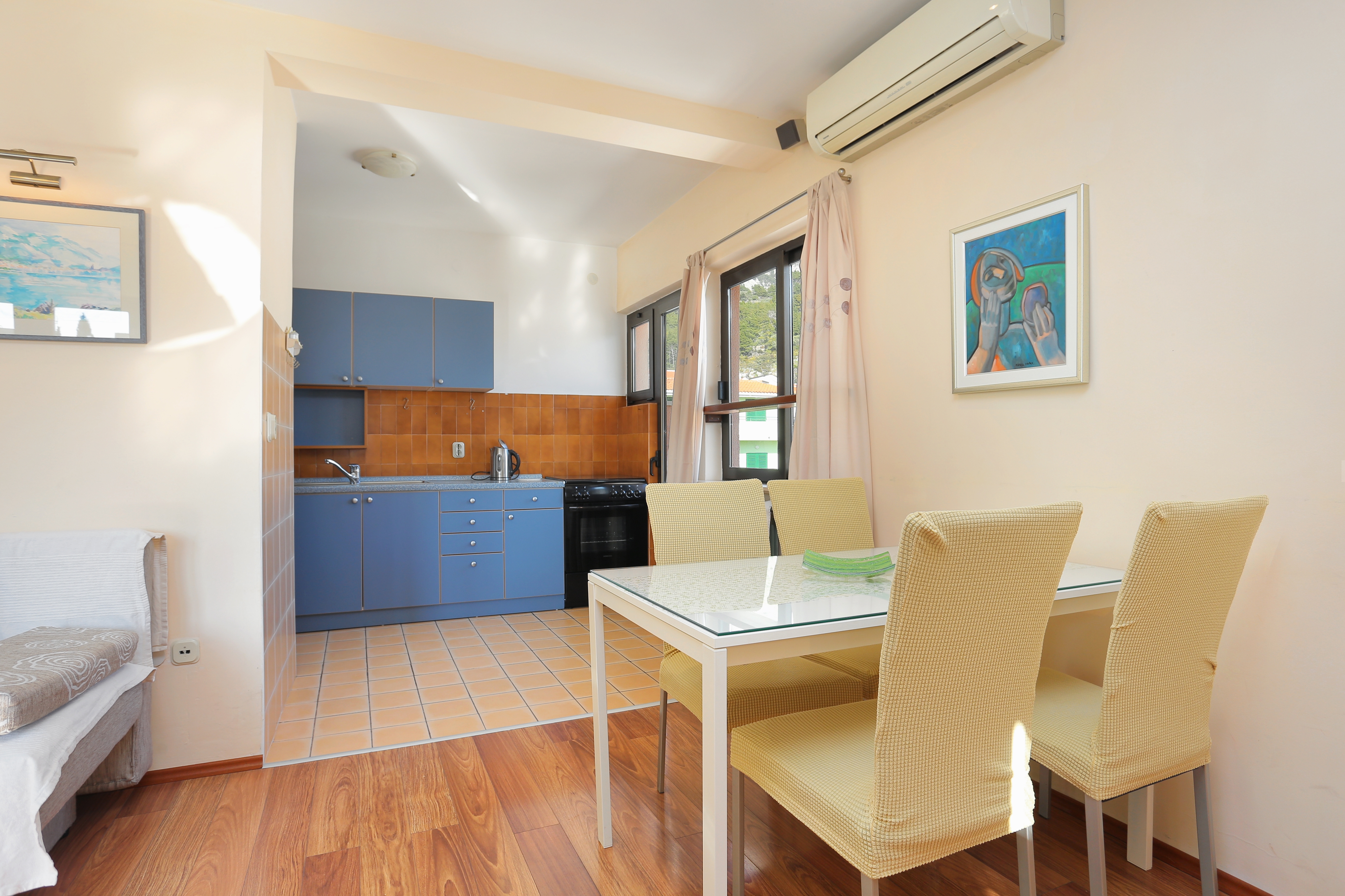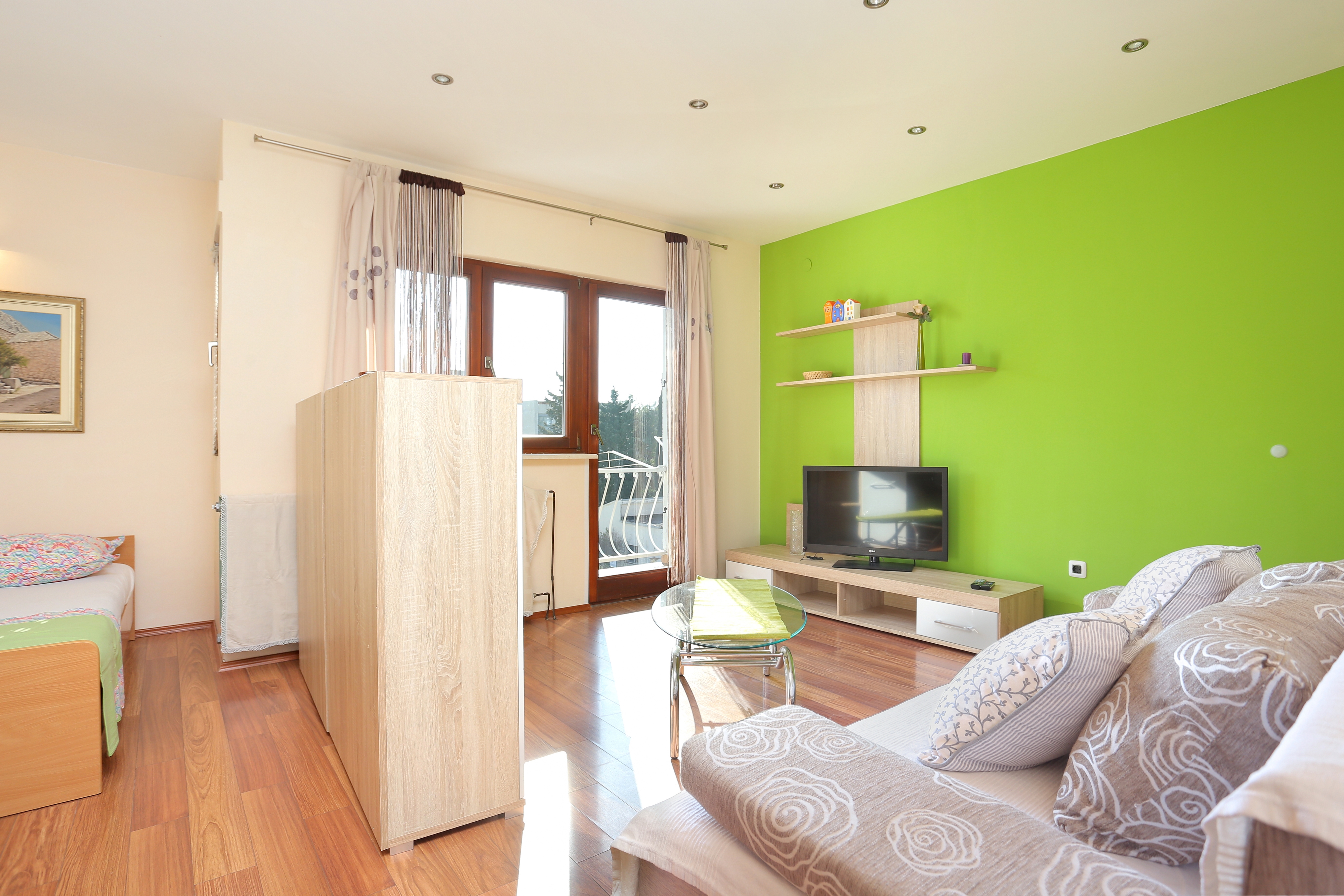 Apartment can accommodate 5 guests. Beds are situated in 1 sleeping rooms, but also in the dining room, within 62m2. Guests can use a private balcony to enjoy the warm summer evenings. Food can be prepared using barbecue which is shared with other guests too. This accommodation unit welcomes pets at an additional charge. INCLUDED IN THE PRICE: tourist tax, final cleaning, air-conditioning, central heating, parking, garage, internet, laundry, baby cot, iron, ironing board, hairdryer. OBLIGATORY ADDITIONAL COSTS: short stay fee (surcharge depending on a number of booked nights: 30% - 1, 20% - 2, 10% - 3). OPTIONAL ADDITIONAL COSTS: pets (€10.00 per night), additional bed (€10.00 per night). The availability of additional services for your chosen dates of stay, as well as their prices (if none are listed) must be checked ahead of time. Any additional services not shown in the price calculation are payable directly to the property owner and only if used by the visitor.