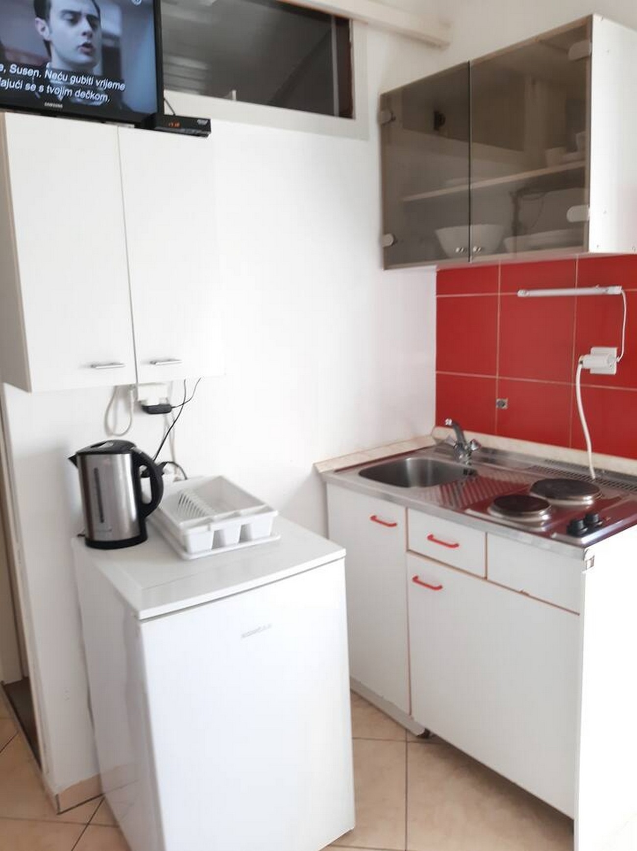 Studio flat can accommodate 2 guests. Beds are situated in living room, within 24m2. Guests can use a private balcony to enjoy the warm summer evenings. The studio offers the sea view. Food can be prepared using barbecue which is shared with other guests too. This accommodation unit welcomes pets at an additional charge. INCLUDED IN THE PRICE: tourist tax, final cleaning, air-conditioning, parking, internet, laundry, iron, ironing board, hairdryer, sunshade, sunchairs. OBLIGATORY ADDITIONAL COSTS: short stay fee (surcharge depending on a number of booked nights: 30% - 1, 20% - 2, 10% - 3). OPTIONAL ADDITIONAL COSTS: breakfast (€5.00, a 50% discount for children aged 4 to 12 years, Children up to age 4 free of charge), boat mooring (€5.00 per night), pets (€7.00 per night), bicycle (€5.00 daily (per piece)). The availability of additional services for your chosen dates of stay, as well as their prices (if none are listed) must be checked ahead of time. Any additional services not shown in the price calculation are payable directly to the property owner and only if used by the visitor.