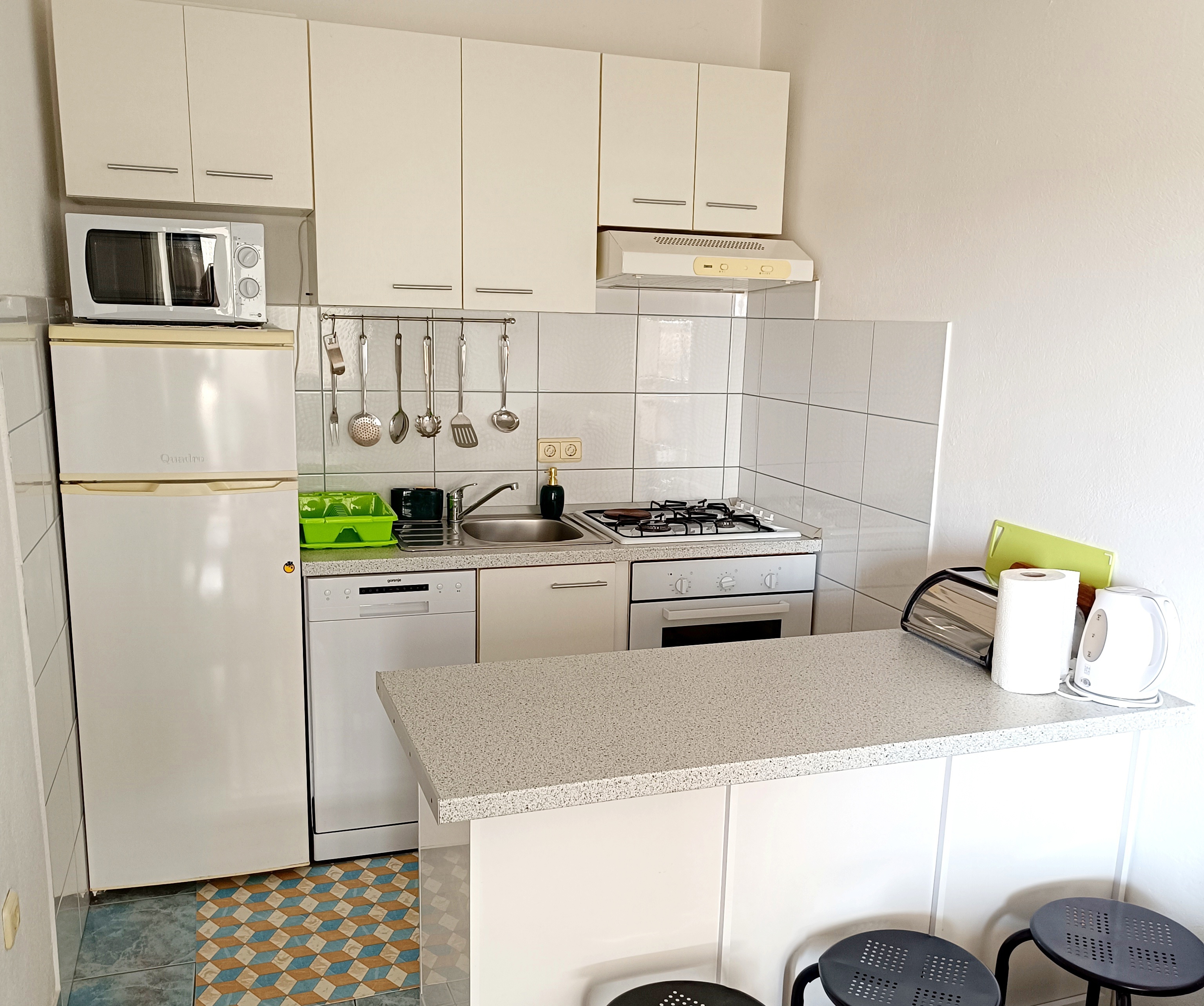 Apartment can accommodate 3 guests. Beds are situated in 1 sleeping rooms, but also in the living room, within 46m2. Guests can use a private terrace to enjoy the warm summer evenings. The apartment offers the sea view. Food can be prepared using barbecue which is shared with other guests too. INCLUDED IN THE PRICE: tourist tax, final cleaning, air-conditioning, parking, internet, iron, ironing board, hairdryer. OPTIONAL ADDITIONAL COSTS: laundry (€5.00 washing). The availability of additional services for your chosen dates of stay, as well as their prices (if none are listed) must be checked ahead of time. Any additional services not shown in the price calculation are payable directly to the property owner and only if used by the visitor.