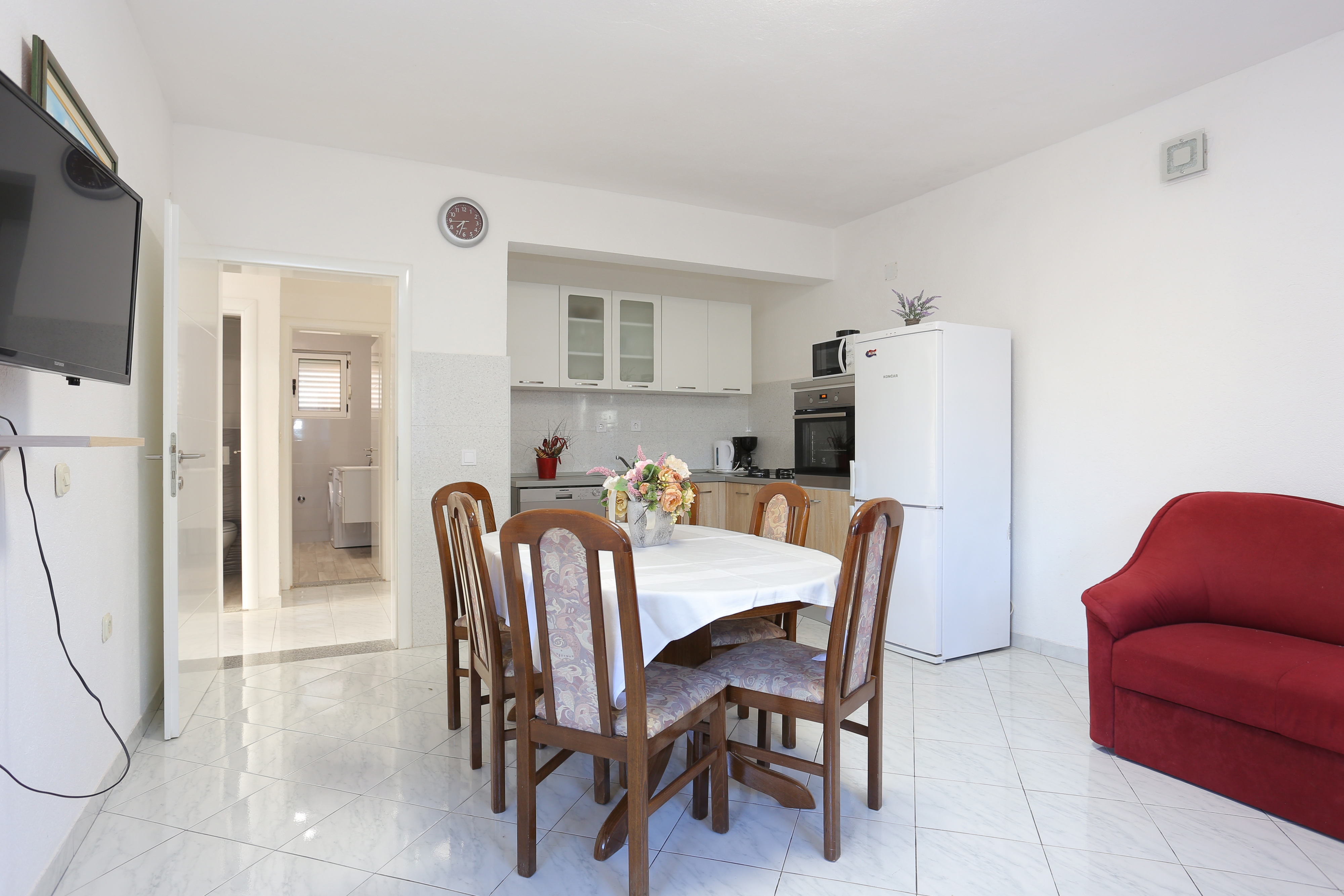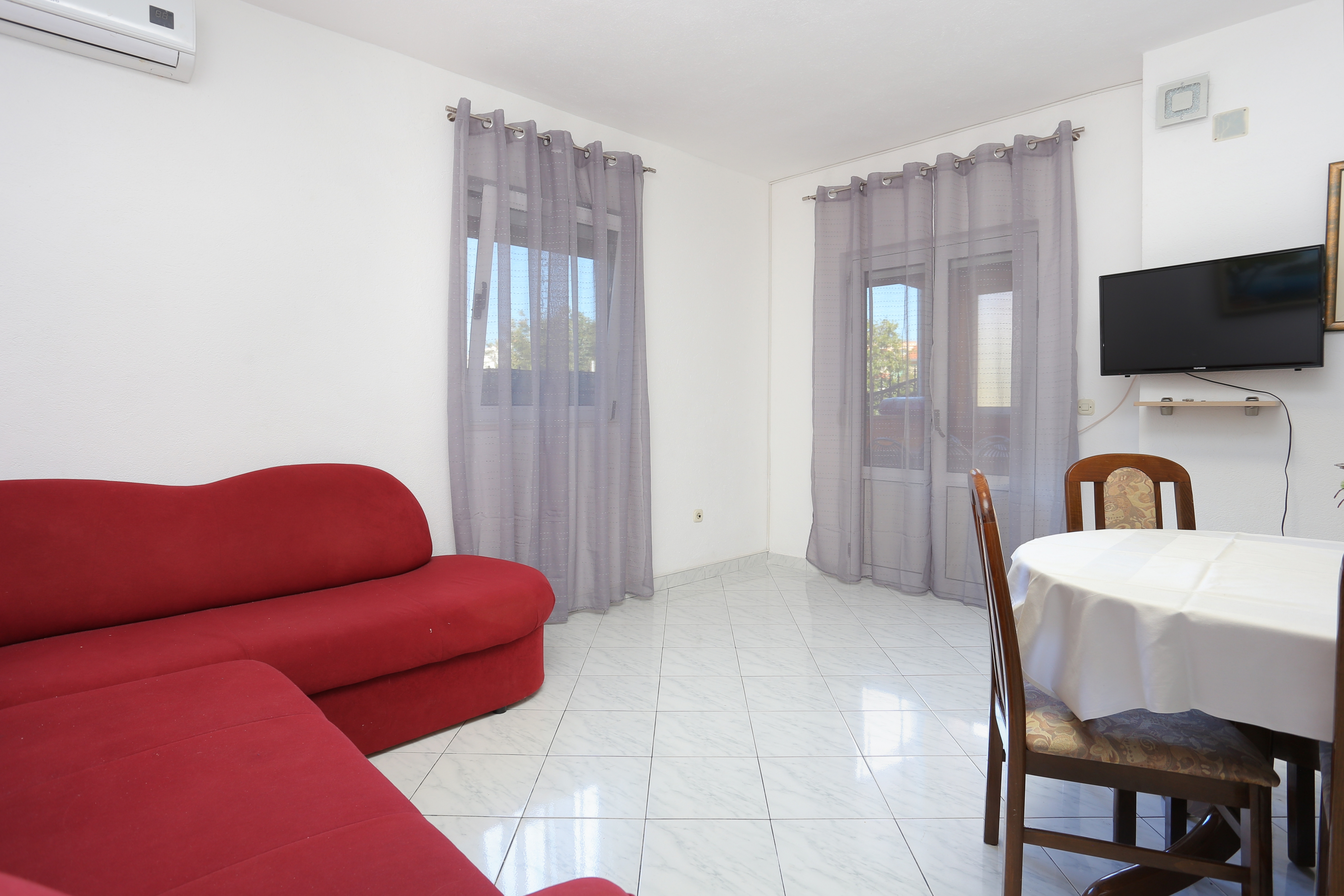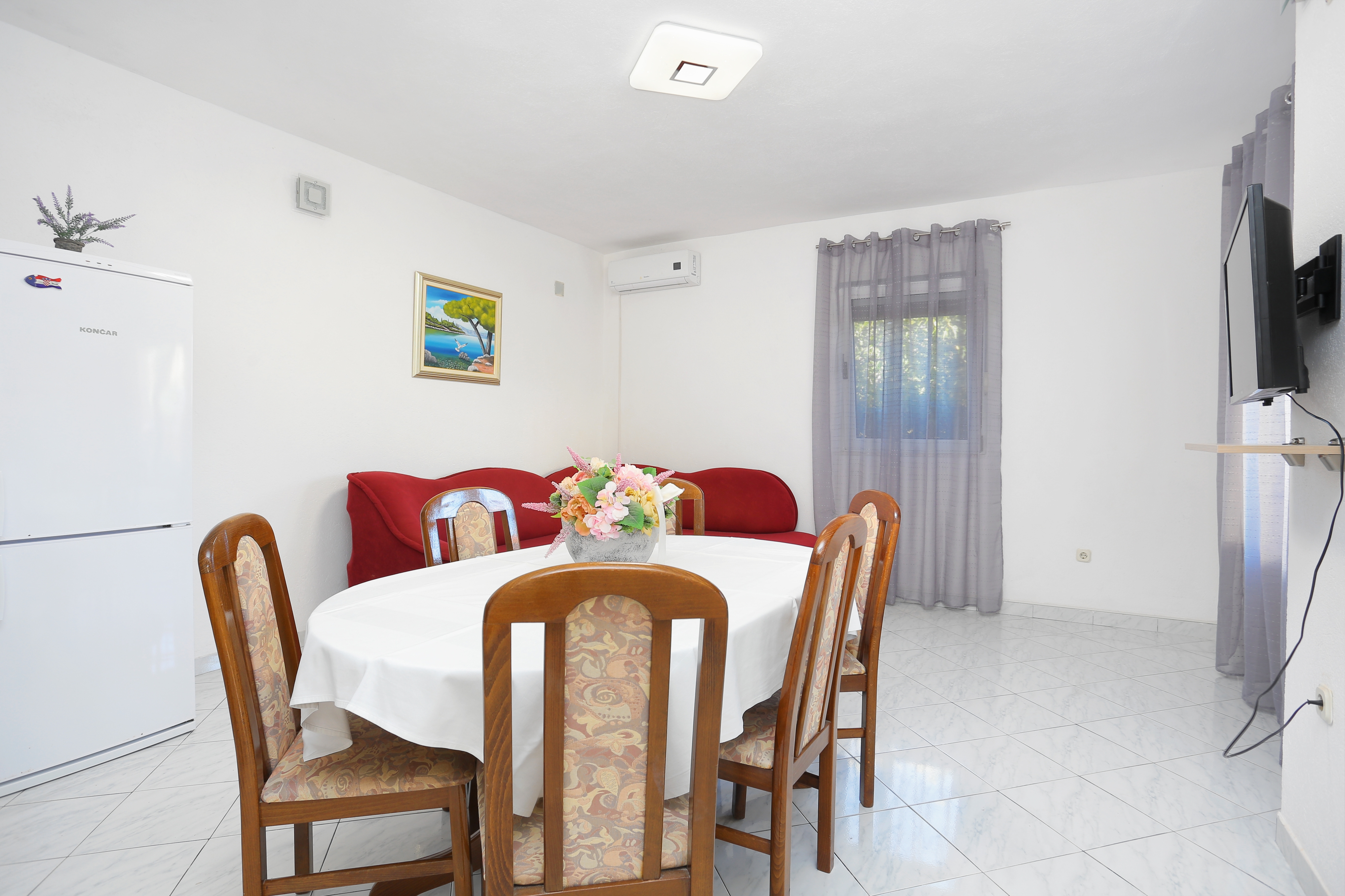 Apartment can accommodate 8 guests. Beds are situated in 3 sleeping rooms, but also in the living room, within 65m2. Guests can use a private terrace to enjoy the warm summer evenings. Food can be prepared using barbecue which is shared with other guests too. Some of the rooms of the accommodation unit are not connected with the rest of the unit. INCLUDED IN THE PRICE: tourist tax, final cleaning, air-conditioning, parking, internet, iron, ironing board, hairdryer. The availability of additional services for your chosen dates of stay, as well as their prices (if none are listed) must be checked ahead of time. Any additional services not shown in the price calculation are payable directly to the property owner and only if used by the visitor.