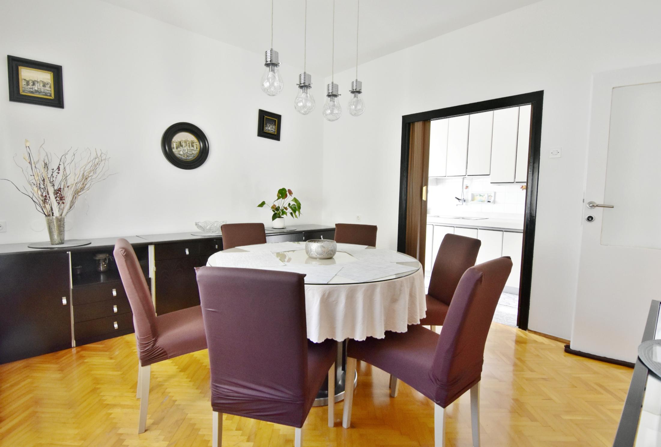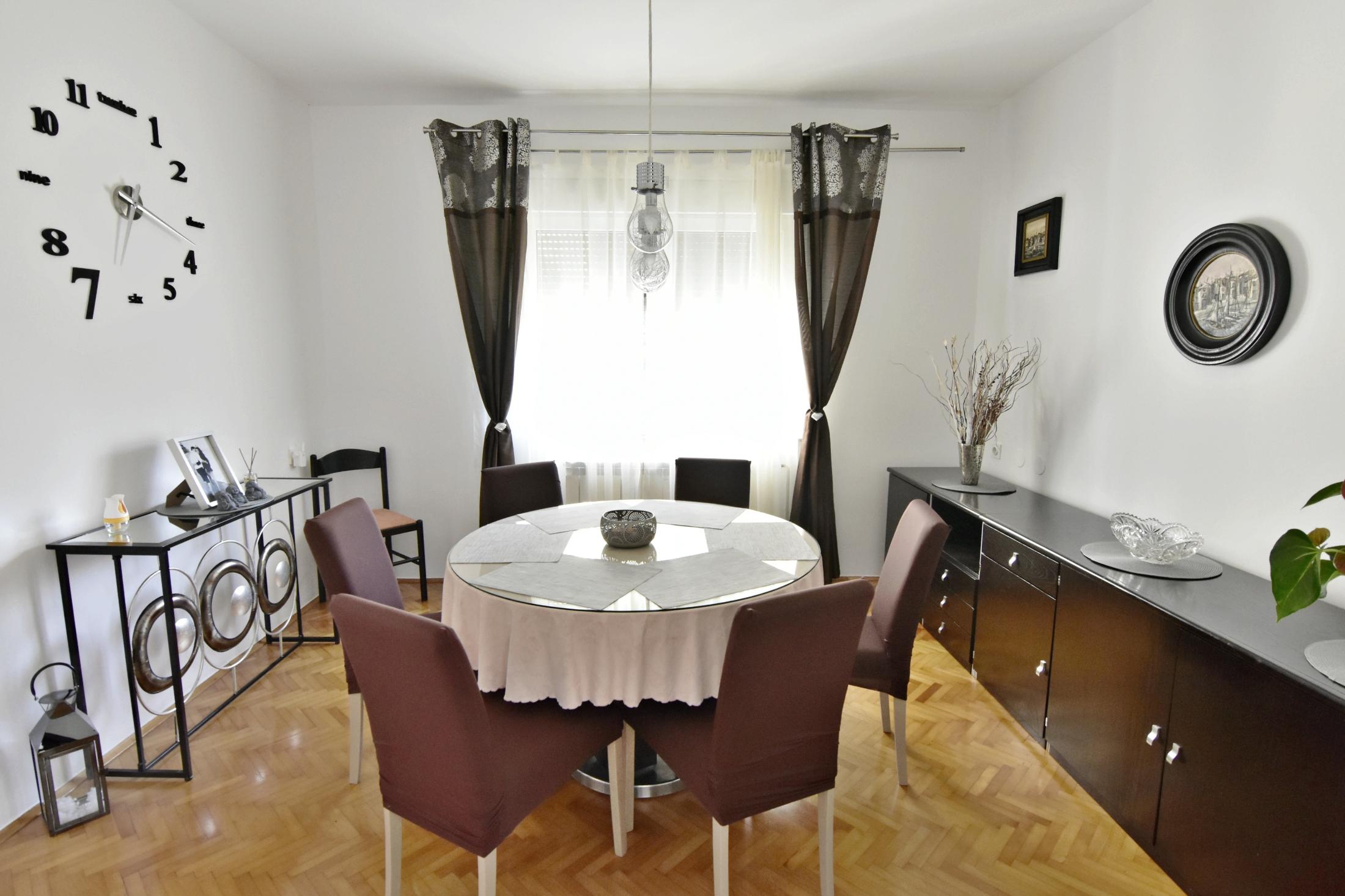 Apartment can accommodate 6 guests. Beds are situated in 3 sleeping rooms, but also in the living room, within 92m2. Guests can use a private terrace to enjoy the warm summer evenings. Food can be prepared using barbecue which is shared with other guests too. INCLUDED IN THE PRICE: tourist tax, final cleaning, air-conditioning, parking, internet, iron, ironing board, hairdryer. The availability of additional services for your chosen dates of stay, as well as their prices (if none are listed) must be checked ahead of time. Any additional services not shown in the price calculation are payable directly to the property owner and only if used by the visitor.