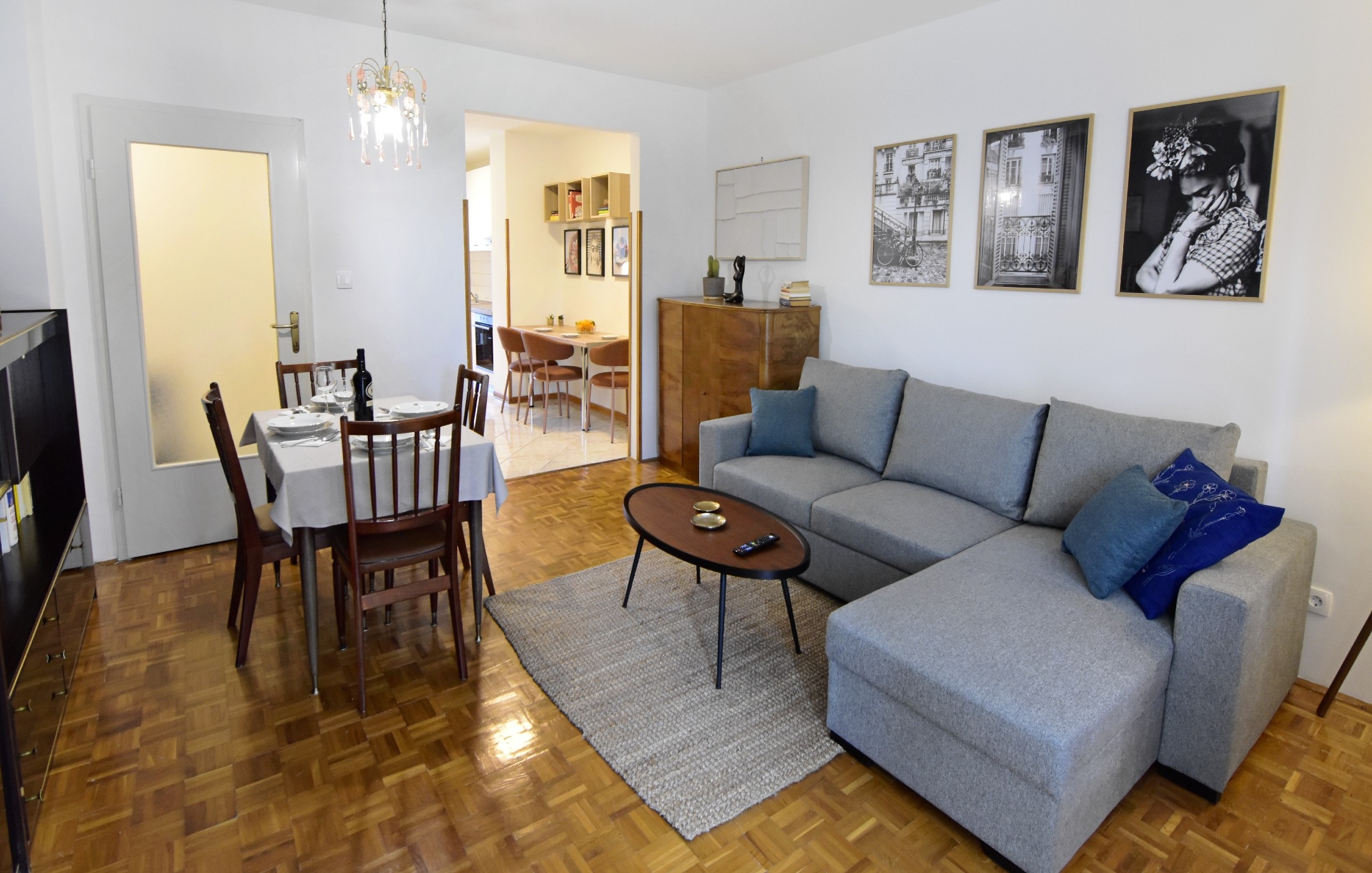 Apartment can accommodate 5 guests. Beds are situated in 2 sleeping rooms, but also in the living room, within 59m2. Guests can use a private balcony to enjoy the warm summer evenings. INCLUDED IN THE PRICE: tourist tax, final cleaning, air-conditioning, internet, iron, ironing board, hairdryer. The availability of additional services for your chosen dates of stay, as well as their prices (if none are listed) must be checked ahead of time. Any additional services not shown in the price calculation are payable directly to the property owner and only if used by the visitor.