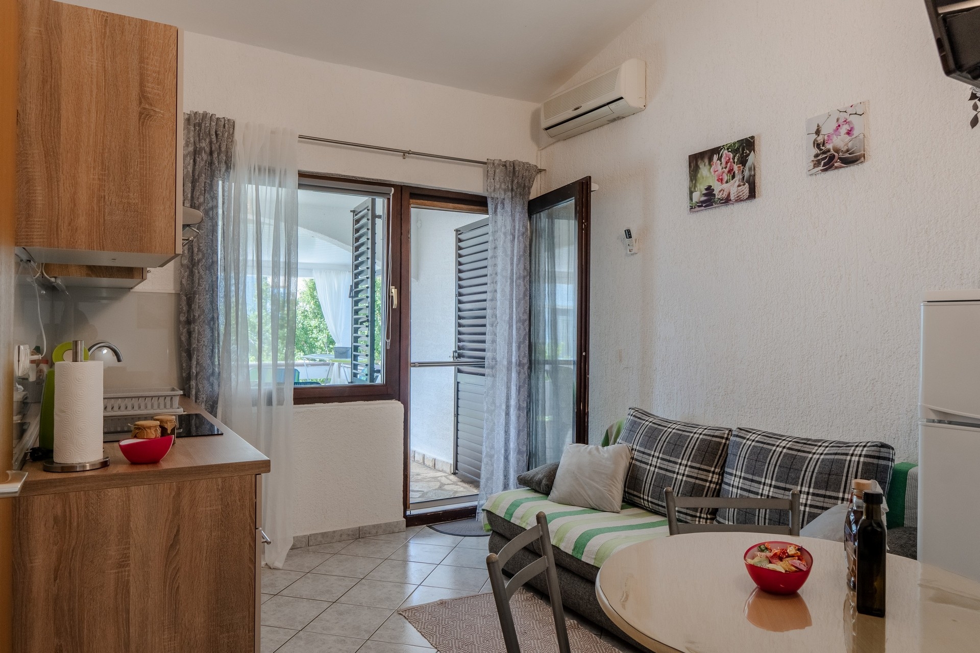 Apartment can accommodate 4 guests. Beds are situated in 1 sleeping rooms, but also in the living room, within 23m2. Guests can use a private terrace to enjoy the warm summer evenings. Food can be prepared using barbecue which is shared with other guests too. INCLUDED IN THE PRICE: tourist tax, final cleaning, air-conditioning, parking, internet, hairdryer. The availability of additional services for your chosen dates of stay, as well as their prices (if none are listed) must be checked ahead of time. Any additional services not shown in the price calculation are payable directly to the property owner and only if used by the visitor.