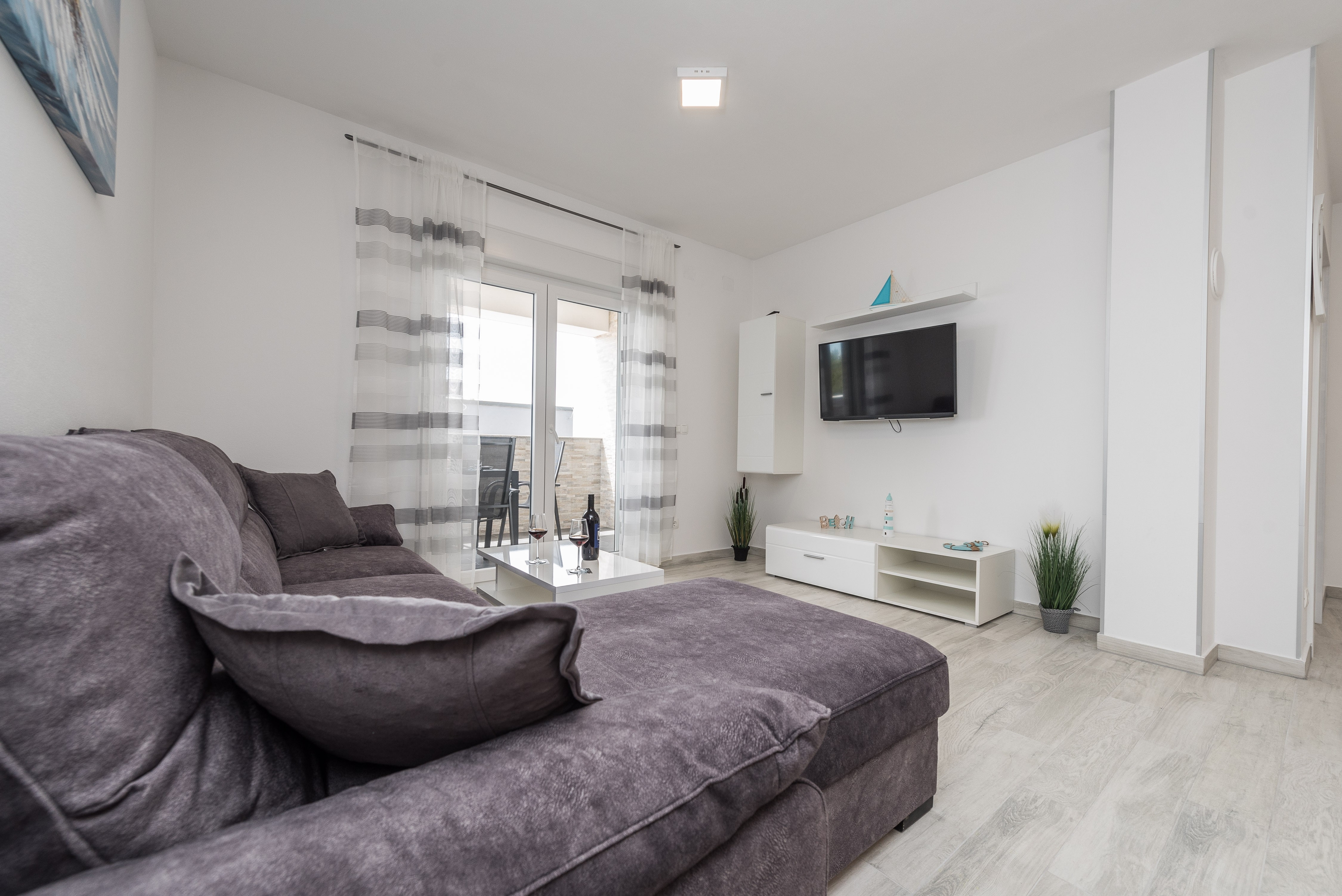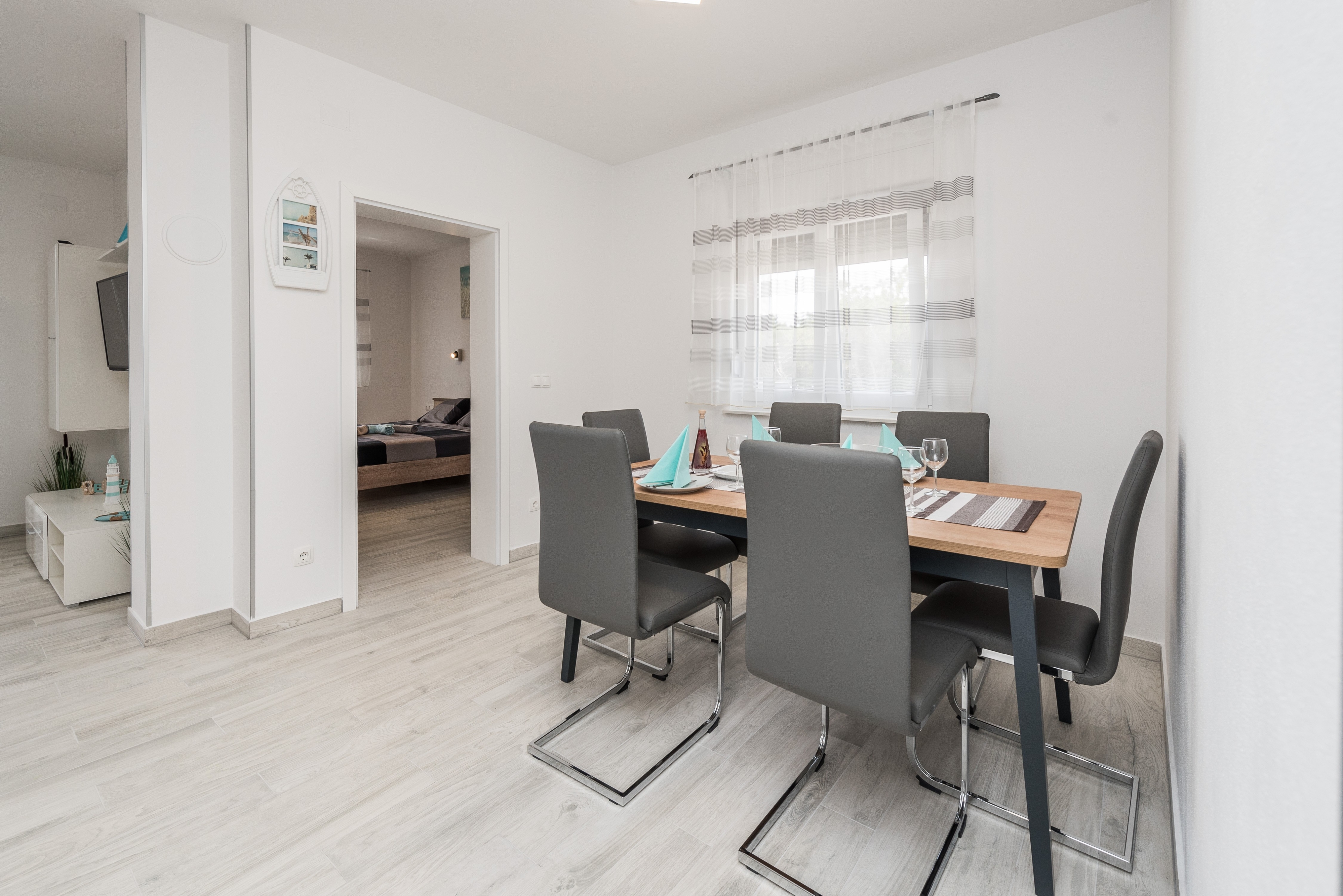 Apartment can accommodate 6 guests. Beds are situated in 2 sleeping rooms, but also in the living room, within 59m2. Guests can use a private terrace to enjoy the warm summer evenings. Food can be prepared using barbecue which is shared with other guests too. INCLUDED IN THE PRICE: tourist tax, final cleaning, air-conditioning, parking, internet, baby cot, iron, ironing board, hairdryer. OBLIGATORY ADDITIONAL COSTS: short stay fee (surcharge depending on a number of booked nights: 30% - 1, 20% - 2, 10% - 3). The availability of additional services for your chosen dates of stay, as well as their prices (if none are listed) must be checked ahead of time. Any additional services not shown in the price calculation are payable directly to the property owner and only if used by the visitor.